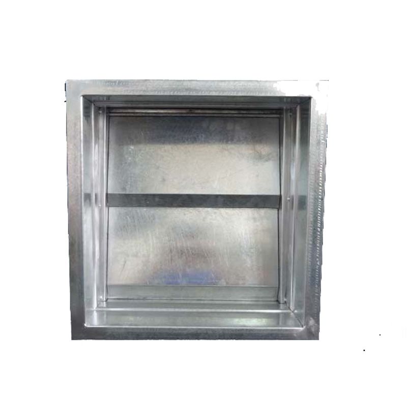 現有一種排煙防火止回閥,轉軸位于進煙口的下部,他的轉軸是活動的,當排煙機開啟時,葉片的底邊轉動使葉片打開,氣流斜著朝上流動進入排煙道,進入排煙道后對排煙道內上升的氣流影響較小,排煙就會很順暢,排煙量也會很大,排煙機的噪聲就相對較小。當排煙機關閉后葉片的下部設的配重就會把葉片拉回來達到關閉止回的功能。對過適當的配重設置可以使葉片的開啟角度接近90度。