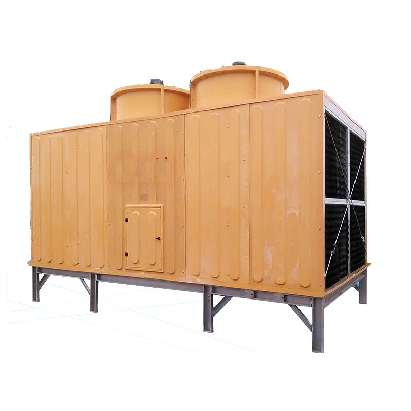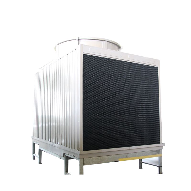 方形橫流式玻璃鋼冷卻塔采用兩側進風,靠頂部的風機,使空氣經由塔兩側的填料,與熱水進行介質交換,濕熱空氣再排向塔外。填料采用兩面有凸點的點波片,通過安裝頭使點波片粘結成整體,以提高剛性,兩面的凸點還可避免直接滴水,因此提高了水膜形成能力,填料尾部設有收水措施。